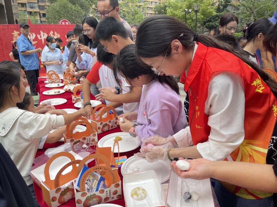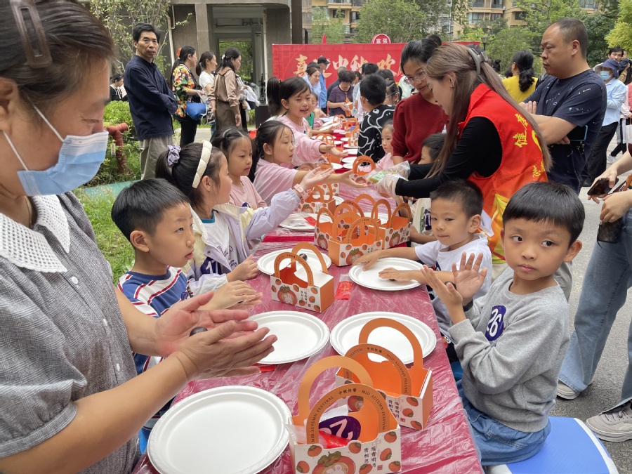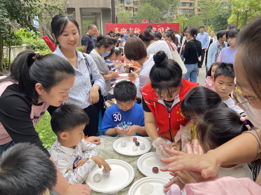 中秋、国庆节前夕、健康医学院、食品学院携手三门社区共同开展巧手做月饼、制香囊活动,除了本次报名参加活动的70余组家庭外,还吸引到了其他社区的小朋友们前来参加。在做月饼环节,大家按照步骤取皮、放团馅,然后整理形状再放入模具,最后轻轻压一压,一款款独特并充满浓浓情谊的月饼就在他们的手中完成了。在制香囊环节,志愿者们准备了艾叶、薄荷、丁香、藿香等中药材,小朋友们将制作香囊的工作台围得水泄不通,一只只香囊在他们灵巧的双手下精彩呈现。活动现场欢声笑语,其乐融融。