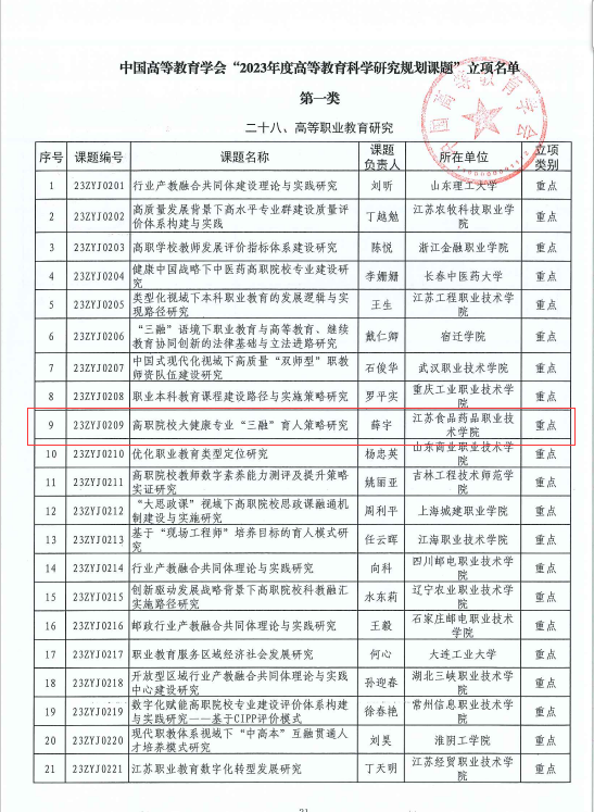 近日,中国高等教育学会公布了“2023年度高等教育科学研究规划课题”立项名单,乐竞薛宇书记和倪秀芹老师分别牵头申报的两项课题获批重点项目,立项数量居全国高职院校第七位。