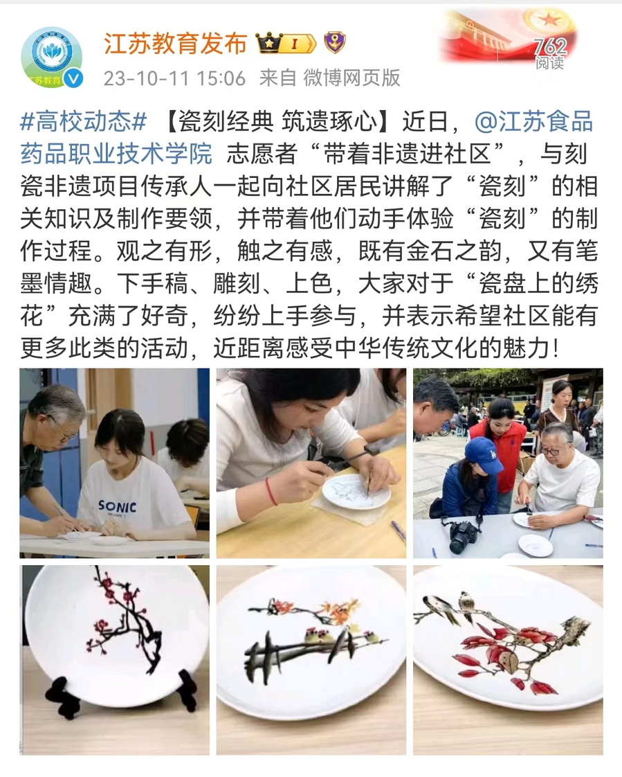近日,乐竞志愿者“带着非遗进社区”,与刻瓷非遗项目传承人一起向社区居民讲解了“瓷刻”的相关知识及制作要领,并带着他们动手体验“瓷刻”的制作过程。观之有形,触之有感,既有金石之韵,又有笔墨情趣。下手稿、雕刻、上色,大家对于“瓷盘上的绣花”充满了好奇,纷纷上手参与,并表示希望社区能有更多此类的活动,近距离感受中华传统文化的魅力!