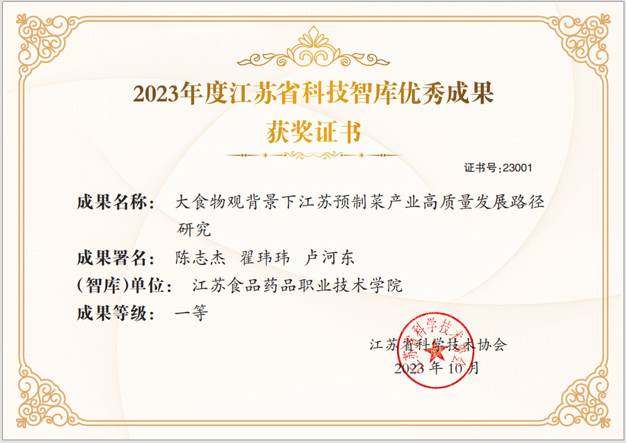 近日,从江苏省科学技术协会获悉,由乐竞陈志杰副教授、翟玮玮教授牵头完成的研究报告《大食物观背景下江苏预制菜产业高质量发展路径研究》荣获首届江苏省科技智库优秀成果一等奖。