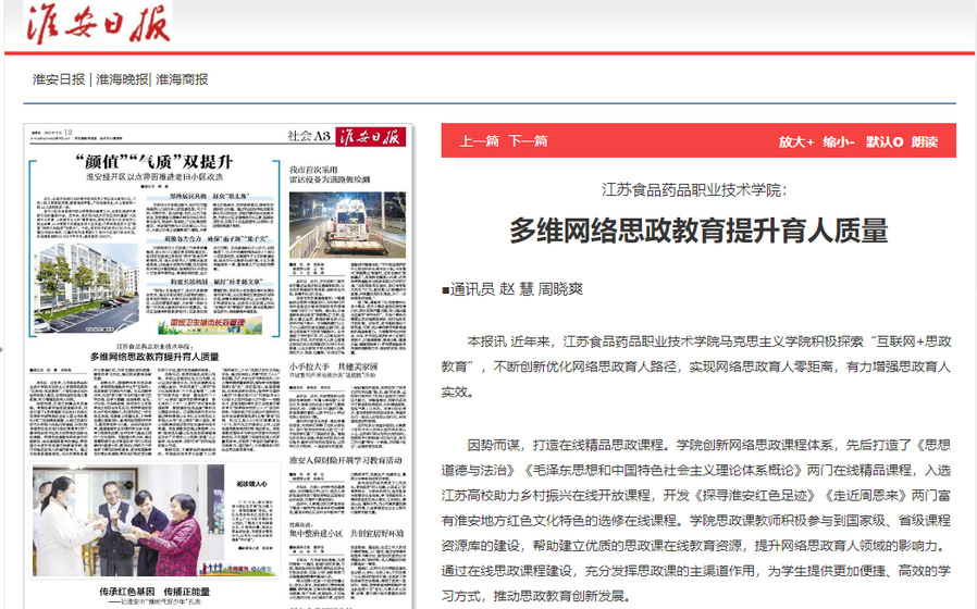 因势而谋,打造在线精品思政课程。学院创新网络思政课程体系,先后打造了《思想道德与法治》《毛泽东思想和中国特色社会主义理论体系概论》两门在线精品课程,入选江苏高校助力乡村振兴在线开放课程,开发《探寻淮安红色足迹》《走近周恩来》两门富有淮安地方红色文化特色的选修在线课程。学院思政课教师积极参与到国家级、省级课程资源库的建设,帮助建立优质的思政课在线教育资源,提升网络思政育人领域的影响力。通过在线思政课程建设,充分发挥思政课的主渠道作用,为学生提供更加便捷、高效的学习方式,推动思政教育创新发展。