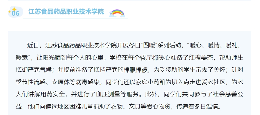 近日,乐竞开展冬日“四暖”系列活动,“暖心、暖情、暖礼、暖意”,让阳光晒到每个人的心里。学校在每个餐厅都暖心准备了红糖姜茶,帮助师生抵御严寒气候;并提前准备了抵挡严寒的棉服棉被,为受资助的学生带去了关怀;针对季节性流感、支原体等病毒感染,同学们还以家庭小药箱为切入点走进爱老社区,为老人们讲解用药安全,并进行了血压测量等服务。此外,同学们共同参与了社会慈善公益,他们向偏远地区困难儿童捐助了衣物、文具等爱心物资,传递着冬日温情。