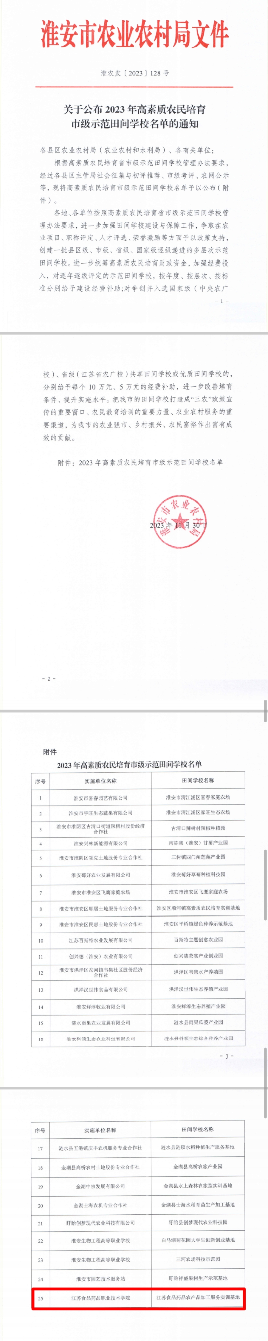 近日,淮安市农业农村局发布了《关于公布2023年高素质农民培育市级示范田间学校名单的通知》,乐竞荣获“高素质农民培育市级示范田间学校”称号。