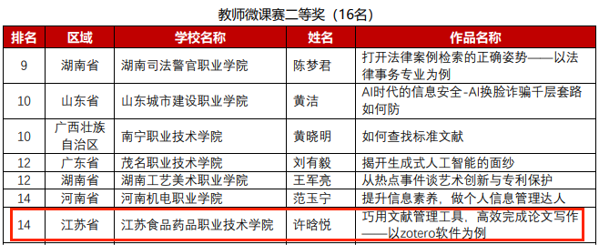 2023 年“中文在线杯”全国高职高专院校信息素养大赛圆满结束,本次大赛由教育部高等学校图书情报工作指导委员会高职高专院校分委员会、高等教育文献保障系统(CALIS)管理中心主办,大赛分为学生赛和教师微课赛。乐竞图书馆许晗悦微课作品《巧用文献管理工具,高效完成论文写作——以zotero软件为例》获全国二等奖、江苏省一等奖;乐竞营本221学生李心悦获江苏省一等奖,营本221李欣陈、徐梦瑶获江苏省二等奖,药学2201李如意、高梦凡获江苏省三等奖;乐竞获得“最佳组织奖”。