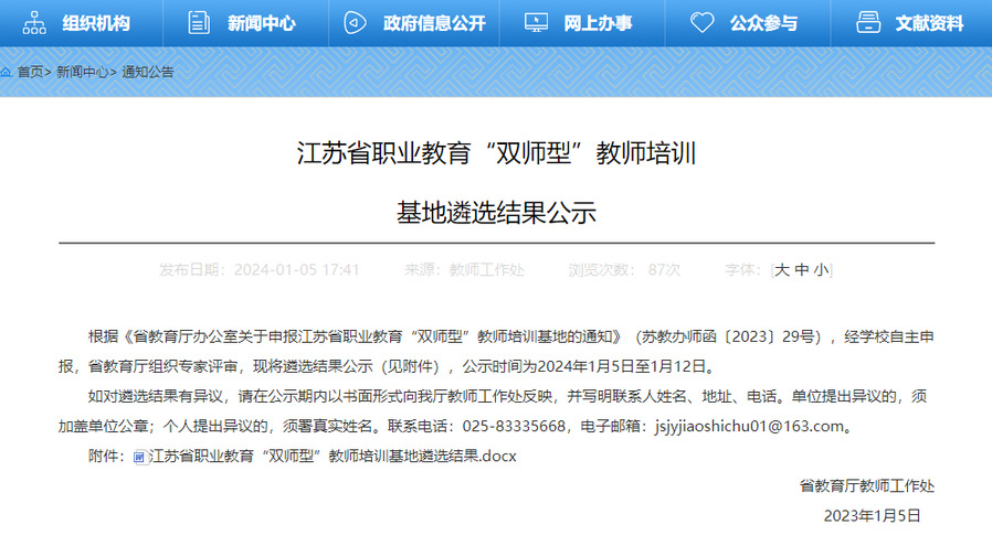 1月5日,江苏省教育厅教师工作处公布了《江苏省职业教育“双师型”教师培训基地遴选结果公示》,乐竞成功入选江苏省职业教育“双师型”教师培训基地名单!