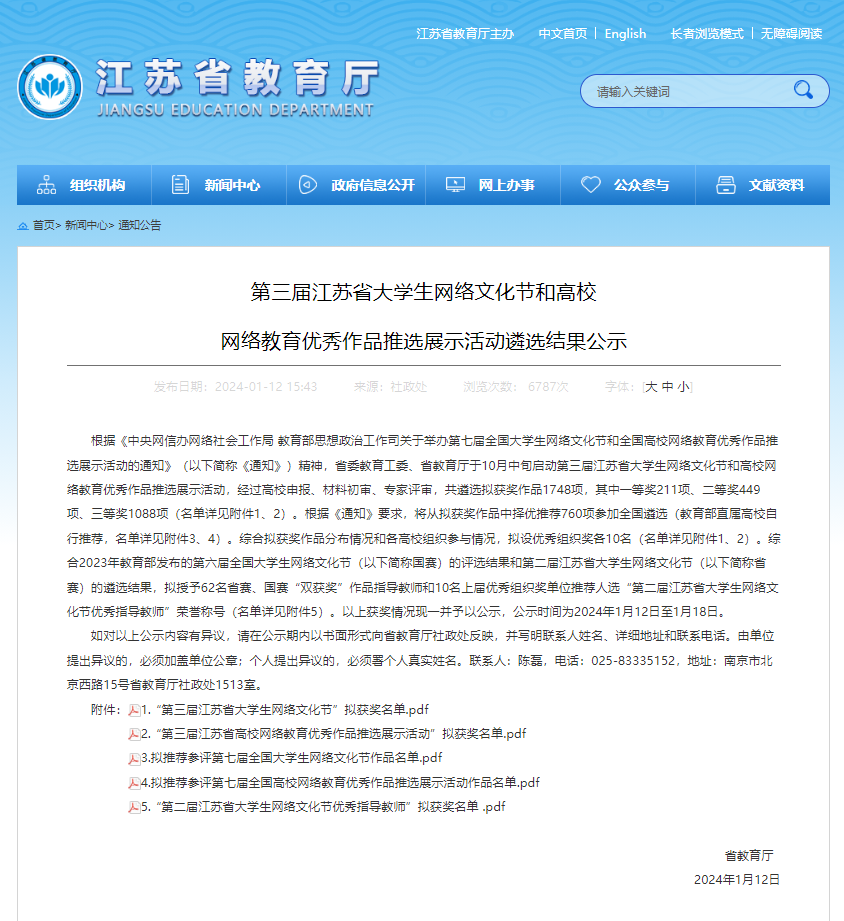 近日,江苏省委教育工委、江苏省教育厅公布了第三届江苏省大学生网络文化节和高校网络教育优秀作品推选展示活动遴选结果。乐竞共9件作品获奖,其中二等奖1项、三等奖8项。