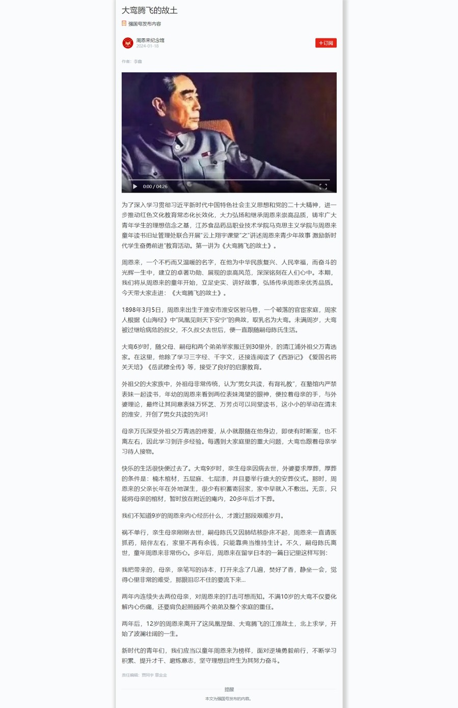为了深入学习贯彻习近平新时代中国特色社会主义思想和党的二十大精神,进一步推动红色文化教育常态化长效化,大力弘扬和继承周恩来崇高品质,铸牢广大青年学生的理想信念之基,乐竞马克思主义学院与周恩来童年读书旧址管理处联合开展“云上翔宇课堂”之“讲述周恩来青少年故事 激励新时代学生奋勇前进”教育活动。第一讲为《大鸾腾飞的故土》。