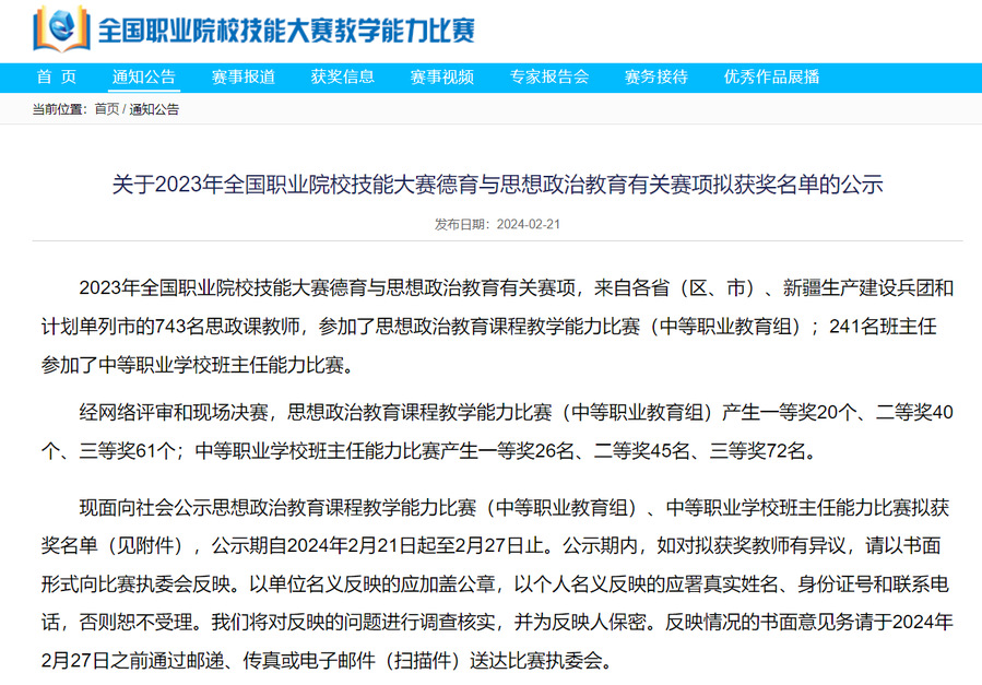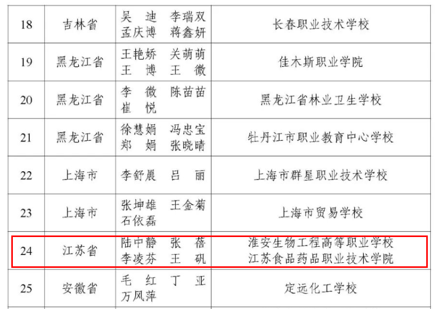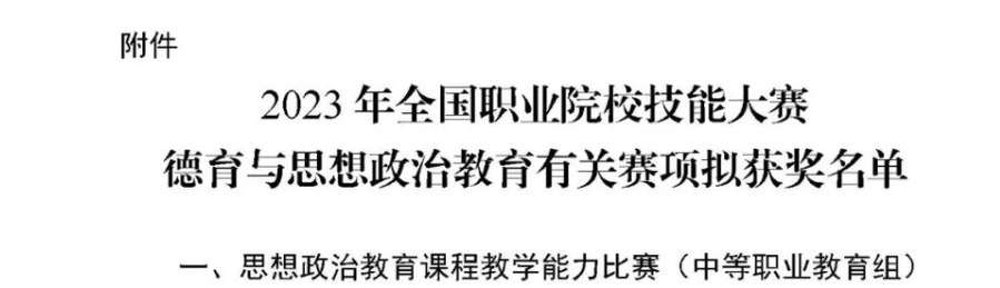 近日,全国职业院校技能大赛德育与思想政治教育有关赛项执委会发布了《2023年中等职业学校班主任能力比赛与思政课教学能力比赛拟获奖名单公示》,乐竞张蓓老师与淮安生物工程高等职业学校陆中静、李凌芬、王矾三位老师组成的教学团队荣获思想政治教育课程组三等奖。