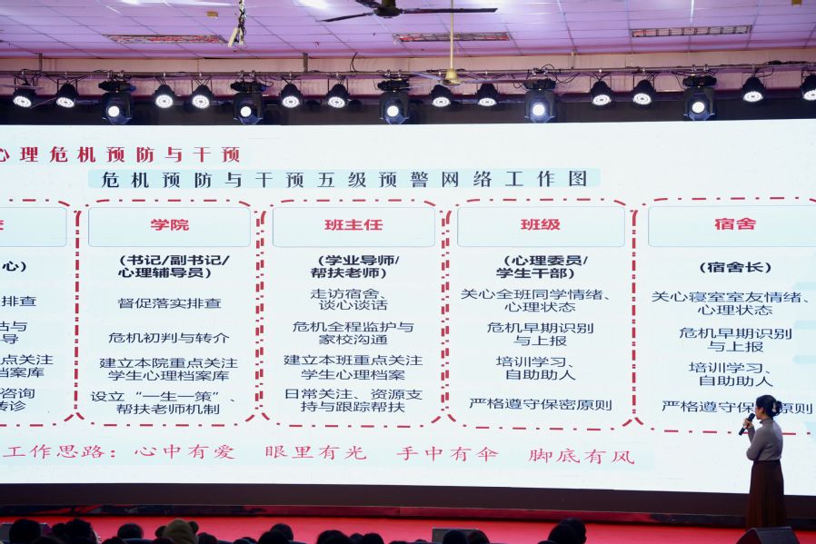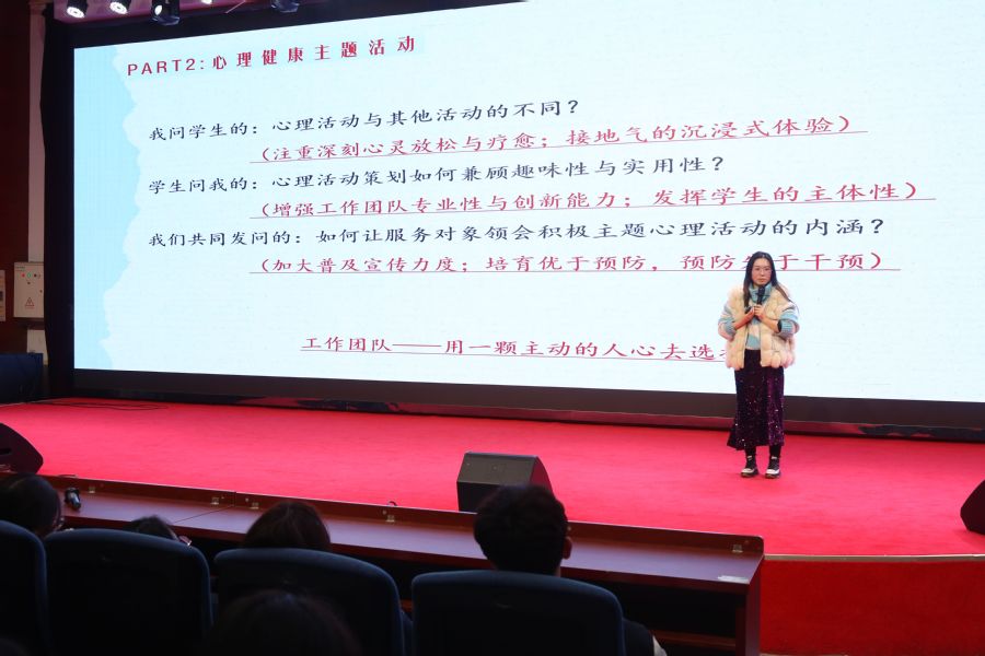 3月5日晚,心理发展服务中心在教学楼C115为全体心理委员、各班宿舍长代表和心理辅导员开展心理委员及宿舍长专题培训。培训尝试“组合式宣讲”的新形式,由中心全体老师担任分享者,以合作者的立场,向同学们发出助人工作邀请,轮流和同学们进行心理各板块工作的交流互动。中心主任李婉君向大家介绍了心理发展服务中心“五位一体”的整体工作框架,分享了学校可以给予学生的各类心理支持资源。其他老师分别带领大家梳理和分享了心理危机的工作体系、心理危机识别的经验与提醒、策划心理活动背后如何渗透育心理念、心理咨询及心理热线的校内外资源等内容。