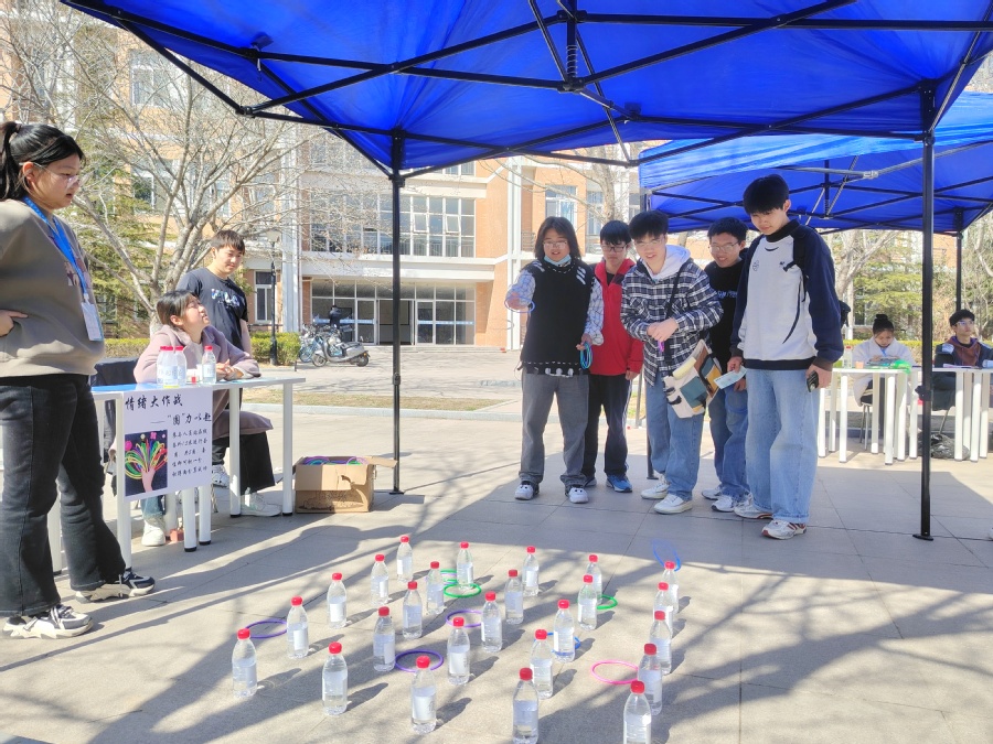 本次活动面向全校师生,共设置三个版块,分别为“‘乒’水相逢”,“情绪大作战”,“齐心协力”。‘乒’水相逢,通过吹动乒乓球到对应学校心理支持资源作答的方式,让同学们了解身边恰到好处的心理支持资源。情绪大作战,由‘羽’拍即散和‘圈’力以赴组成,以套圈套住好情绪和羽毛球击中坏情绪的方式,让同学们身临其境体验情绪的来去流通之路。齐心协力,由‘球’同存异和取长补短组成,用双人背部运球和多人跳大绳的方式,让同学们增强人际关系的联结。活动通过集印章的方式为参与者争取盲盒抽奖的机会,吸引了同学们的广泛参与,在遨游心海的过程中抚慰心灵,关注自身心理健康。