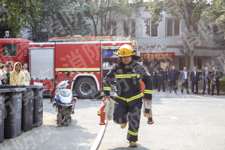 下午14:00整,演练正式开始,模拟火场形成,现场浓烟滚滚。公寓管理员发现火情后,一名管理员立即拨打119报火警,同时吹响紧急疏散口哨,学生听到疏散哨音后,用湿毛巾捂住口鼻开始通过消防疏散通道有序向公寓外安全地带疏散;另一名管理员立刻携带灭火器赶往起火点扑救初起火灾,校园义务消防队接报火警后立即赶赴现场增援救火;城南消防救援站接到119火警报告后,火速驰援现场展开灭火救援行动;在灭火救援过程中发现公寓S8B002宿舍有1名受伤学生,物业管理员立刻拨打120急救电话,120救护车随后赶来现场救护转运受伤学生;参与演练的全体师生在5分钟之内疏散完毕,整个演练过程有条不紊,贴近实战,有效检验了乐竞灭火和疏散逃生预案的科学性,提高了全体学生在火场中的逃生自救能力,检验了乐竞义务消防队扑救初起火灾的能力。