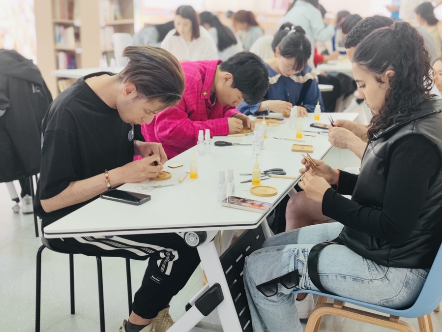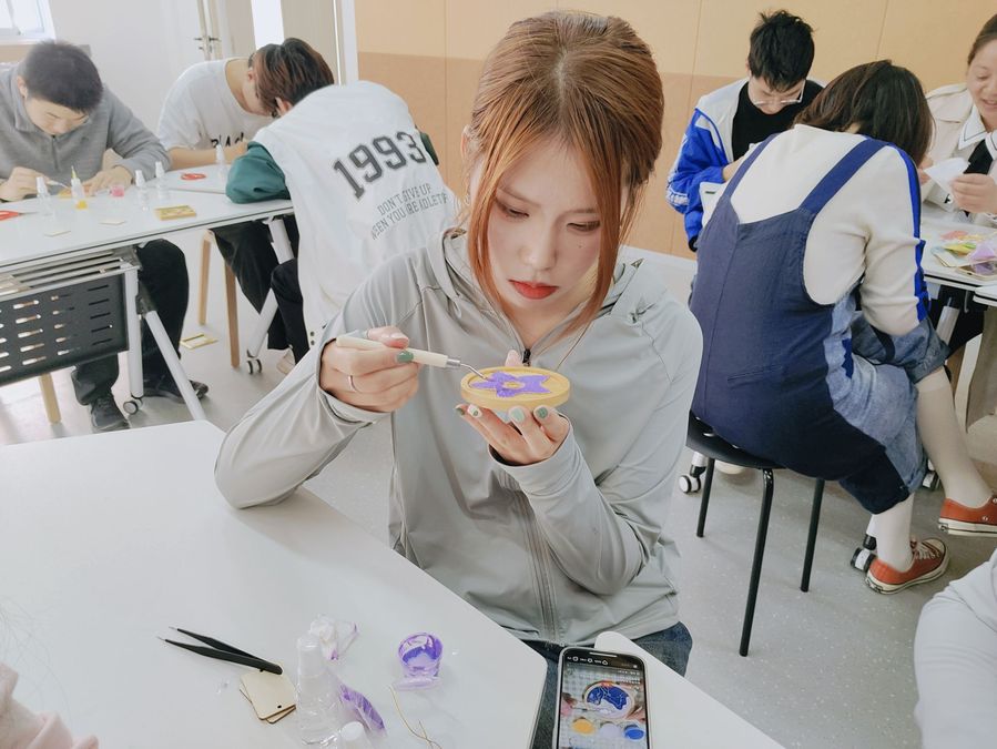 活动中,同学们选取了自己喜爱的宋锦纹样和配色,在老师的指导下,通过绘图、点胶、掐丝、点蓝、覆膜等掐丝珐琅技艺制作木制杯垫。每一步都需要十足的耐心,同学们沿着线稿,小心翼翼地比划着金丝,将金丝调整成合适的大小粘在背板上,再将彩砂调和出需要的颜色,用铲刀少量多次地进行点蓝,最后喷上淋膜胶,一枚枚精致的宋锦纹样杯垫就此成型。正是这些复杂、精细、考究的工序,成就了美轮美奂的艺术品,也让同学们感受到了宋锦纹样和掐丝珐琅的技艺之美,体会到了中国传统文化的博大精深。