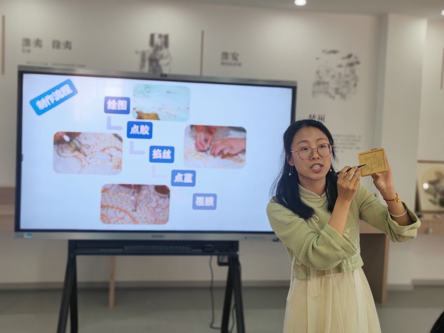 运河两岸非遗灿烂,在运河水的滋养下,江南制造业繁荣发展,创造出细腻典雅、纤巧秀美、质地坚韧的苏州宋锦。宋锦图案多以几何图形为骨架,其中填补花卉、八宝、八仙、八吉祥、瑞草等纹样,当宋锦纹样和掐丝珐琅技艺相融合会碰撞出怎样的火花呢?活动邀请了乐竞传统文化爱好者陈娟老师为同学们讲解宋锦纹样的特点和绘画技巧,并通过掐丝珐琅技艺沉浸式体验宋锦纹样的几何美感。