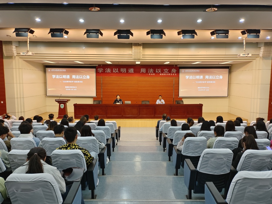 5月15日下午,健康医学院党总支组织开展了“学法以明道,用法以立身”法治教育宣传进校园活动,淮安市开发区公安分局指导员踪铮受邀走进学生安全防范课堂。健康医学院党总支书记郑虎哲、副书记高士杰、辅导员和学生代表200余人参加了活动。活动由高士杰主持。