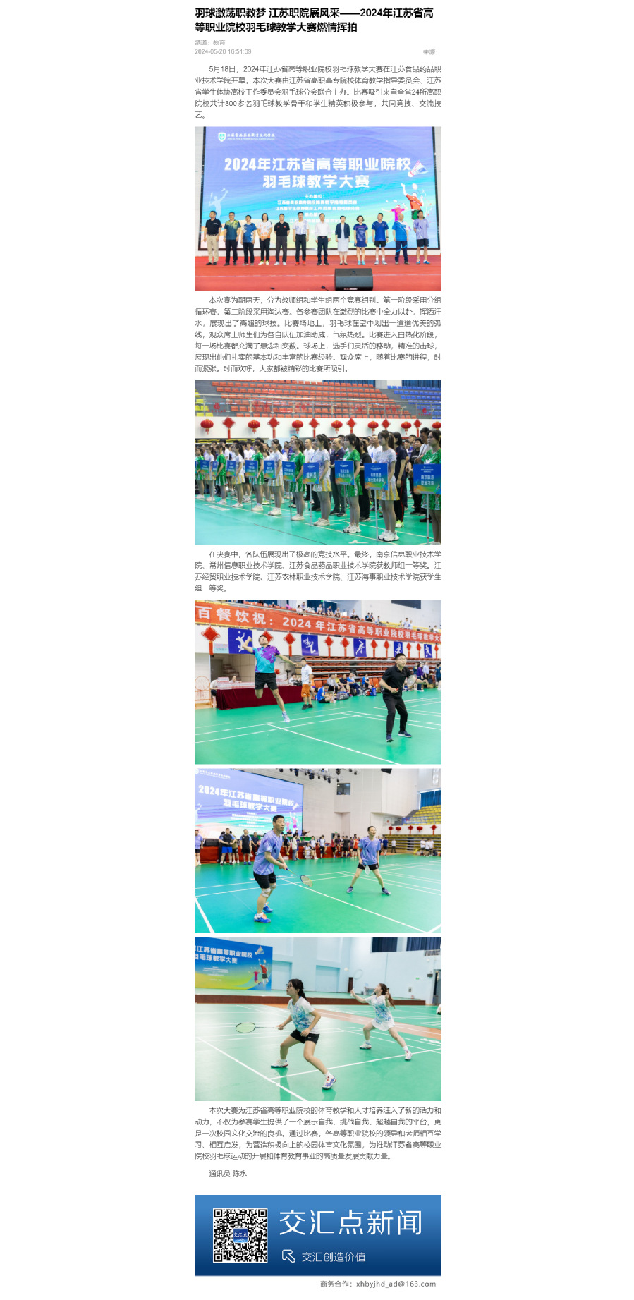 5月18日,2024年江苏省高等职业院校羽毛球教学大赛在乐竞开幕。本次大赛由江苏省高职高专院校体育教学指导委员会、江苏省学生体协高校工作委员会羽毛球分会联合主办。比赛吸引来自全省24所高职院校共计300多名羽毛球教学骨干和学生精英积极参与,共同竞技、交流技艺。