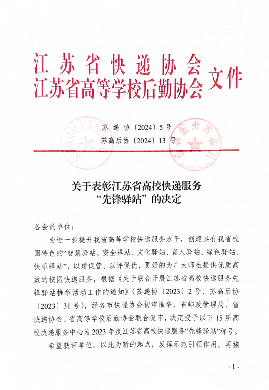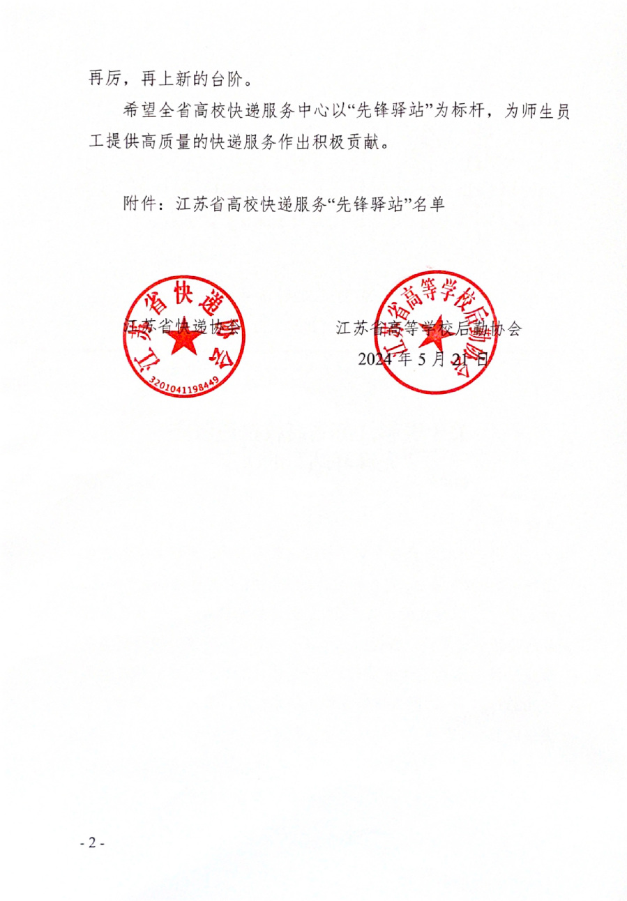 5月21日,江苏省高等学校快递服务现场交流会暨“先锋驿站”表彰大会在南京林业大学召开。经淮安市快递协会初审推荐,江苏省邮政管理局、省快递协会、省高等学校后勤协会实地核查、联合复审,乐竞快递服务中心成功获评“2023年度江苏省高校快递服务‘先锋驿站’称号”。