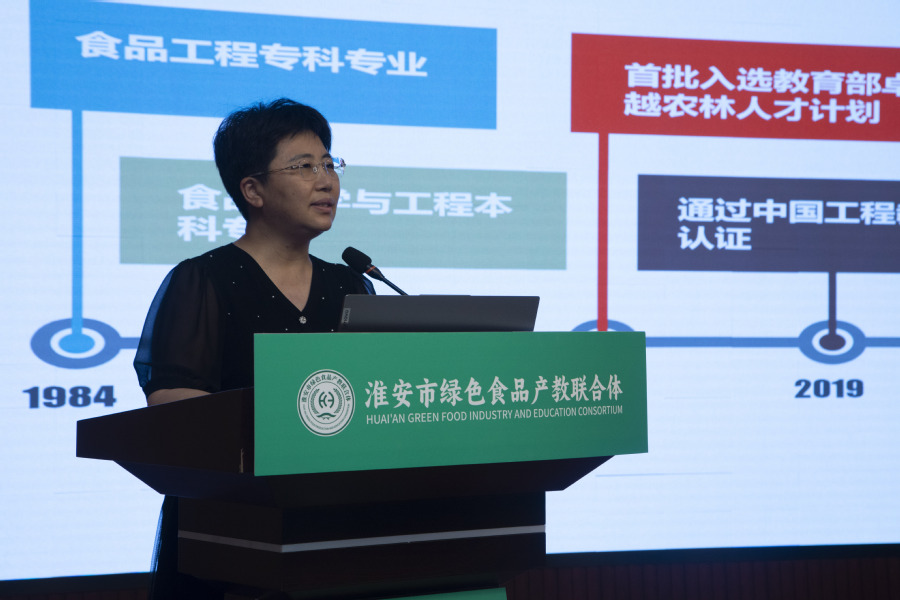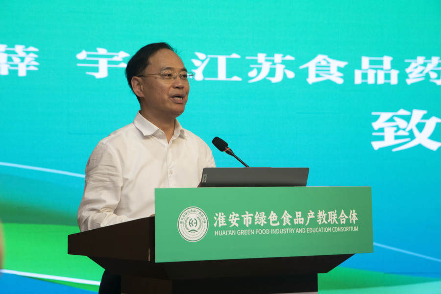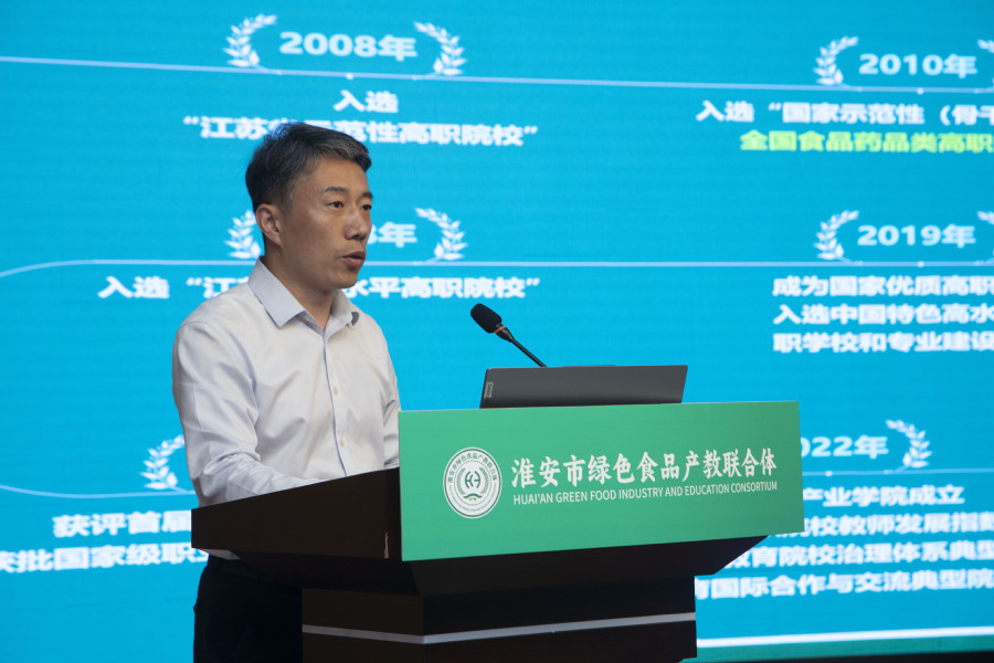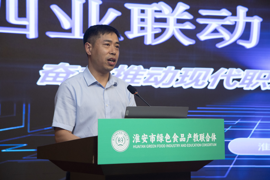 薛宇致欢迎词,他首先向出席大会的领导嘉宾、业界同仁表示诚挚的欢迎和衷心的感谢,强调产业发展需要扎扎实实,教育事业也需要“接地气”,希望本次对接会的举办可以落地见效,更好服务发展新质生产力,推进以教促产、以产助教,构建“产业赋能教育、教育培养人才、人才支撑产业”的产教融合循环生态链,推动淮安市绿色食品产业高质量发展。