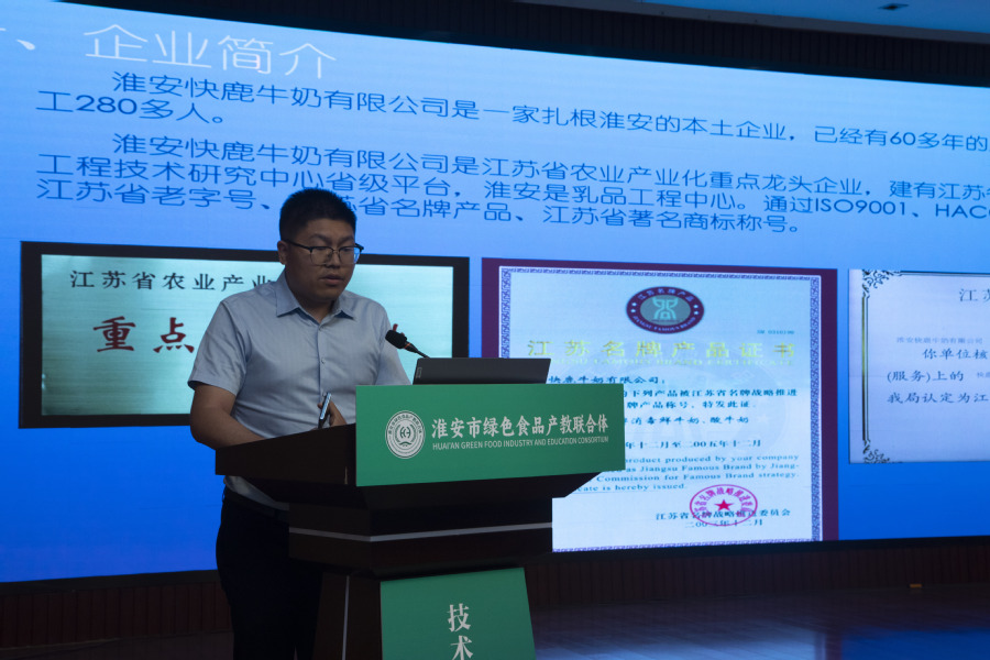 在企业技术需求发布环节,江苏今世缘酒业股份有限公司副总工程师左文霞、江苏百斯特鲜食有限公司高级研发工程师毕宏达以及淮安快鹿牛奶有限公司副总经理曹建贞依次上台作为淮安市绿色食品产教联合体企业代表发布了“高价值化开发利用酿酒副产物——构建基于酿造过程能耗的绿色生态低碳技术”、“药食同源功能性乳制品功效测评及科学评价体系建立”以及“大米品种的筛选和现有工艺的改进”等实实在在的技术需求,这些技术需求为在淮院校的科技服务、技术攻关、成果转化等提供技术合作路径和方向。