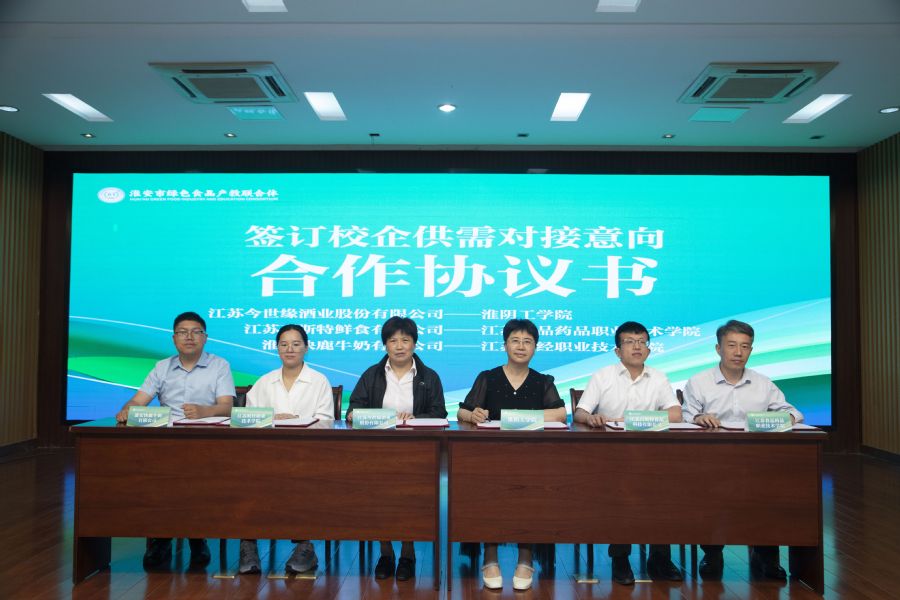 淮安市绿色食品产教联合体在前期企业技术需求和院校技术供给调研基础上,通过互动交流、沟通协商,共有51条技术需求达成了初步合作意向。本次大会上有3家代表企业与3家牵头院校签订了意向合作协议书,它们分别是江苏今世缘酒业股份有限公司、江苏百斯特鲜食有限公司、淮安快鹿牛奶有限公司和淮阴工学院、乐竞、江苏财经职业技术学院。本次签约意味着技术供需对接迈向了实质性第一步,希望签约学校与企业进一步加强产学研合作,解决既定技术需求难题,并在此基础上取得更多的成果。