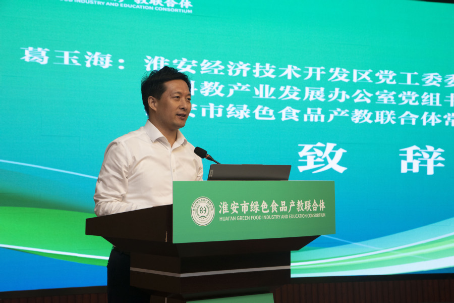 淮安市绿色食品产教联合体常务副理事长、淮安经开区党工委委员、党群工作部部长、科教产业发展办公室党组书记、主任葛玉海致词