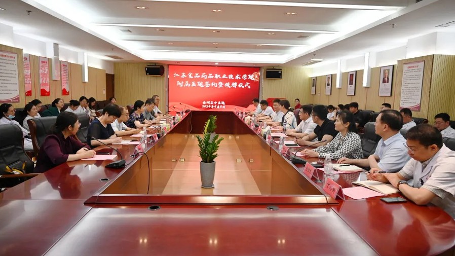 陈松清致欢迎词,表示乐竞和金湖县中医院签约附属医院,为校院合作奠定了雄厚的发展基础、开启了双方高质量发展的新征程,通过深化医教融合,既为医院带来更多资源支持,也为学校提供了更广阔的人才培养平台。
