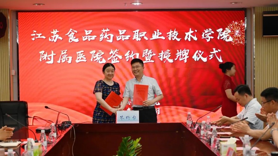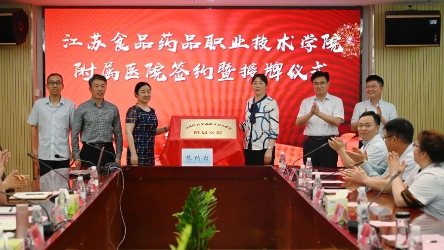 在出席人员的见证下,翟玮玮与陈松清签订了乐竞与金湖县中医院合作协议,随后与会领导共同为“附属医院”揭牌。