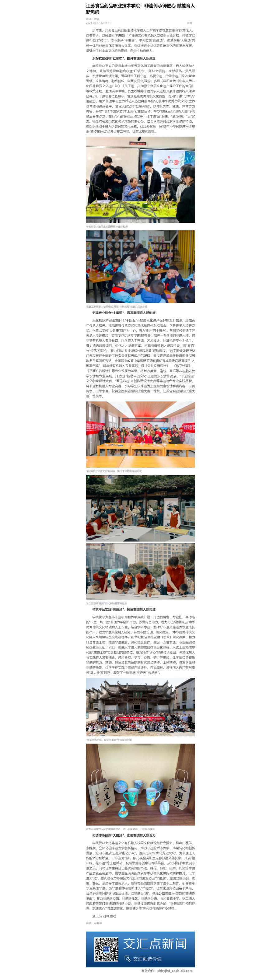 文化和旅游部印发的《“十四五”非物质文化遗产保护规划》强调,加强青年传承人培养。推动传统传承方式和现代教育体系相结合,创新传承人培养方式。学院以学校“大健康”特色为中心,着力推进“四个融合”,首创学校非遗工匠传承人培养模式,实现“诗”和“远方”的珠联璧合,培养一专多能的非遗人才。将非遗有机融入专业教育,以学院人工智能、艺术设计、计算机等专业为抓手,着力遴选非遗项目,优化人才培养方案。将非遗有机融入课程建设,将“育德”与“传艺”相结合,着力打造“专业课程+课程思政”双轨课程,“数字图像处理”等2门课程获评全国轻工行指委课程思政示范课程,课程建设成果获教育部课程思政典型案例优秀奖、全国职业教育中华传统美德教育优秀成果建设培育项目“入围案例奖”。将非遗有机融入专业实践,以《公共设施设计》、《数字绘画》、《平面广告设计》等专业课程为基础,将地方美食、渔鼓、剪纸等非遗融入教学设计和专业实践,打造出 “技艺中的文化”主题海报设计作品展、“非遗绘语”文化创意设计大赛、“看见非遗”文创作品设计大赛等非遗特色专业实践品牌。将非遗有机融入专业竞赛,引导学生以非遗为主题和元素设计参赛内容,以赛促学、以学争赛,获得全国职业院校技能大赛一等奖、江苏省职业院校技能大赛一等奖等