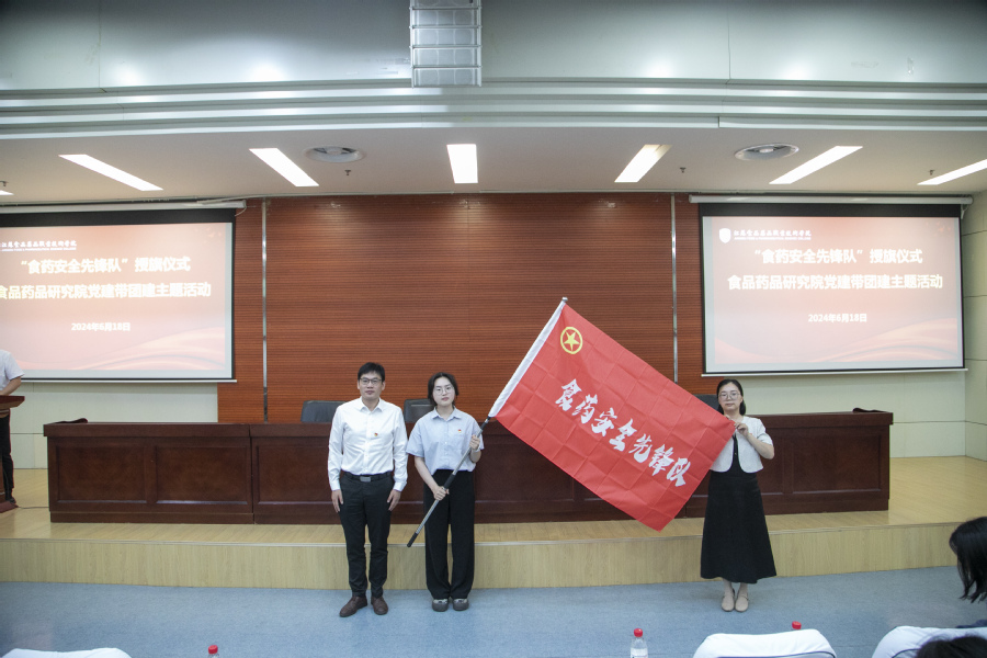 为深入贯彻落实习近平总书记关于食品药品安全“四个最严”要求,培养学生更好地成长为食品药品安全的传播者和践行者,食品药品研究院以党建为引领,成立“食品药品安全先锋队”,6月18日下午在图书馆报告厅举行“食药安全先锋队”授旗仪式——食品药品研究院党建带团建主题活动。副校长焦宇知致辞并为食药安全先锋队授旗,活动由食品药品研究院直属党支部书记吴一凡主持。