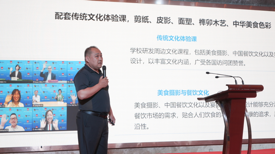 中国教育国际交流协会会长、教育部原副部长刘利民通过视频线上致辞。他指出,中国政府把职业教育摆在了经济社会发展和教育改革创新更加突出的位置,持续推动形成同市场需求相适应、同产业经济与社会结构相匹配的现代职业教育体系,致力于培养更多高素质技术技能人才、能工巧匠、大国工匠。“职教出海、美食同行”作为推动中国餐饮业职业教育国际化发展的创新理念,既为中国餐饮业的国际化发展注入新动力,培养更多高素质技术技能人才,又推动中国文化走向世界,不断增强文化自信和国际影响力。