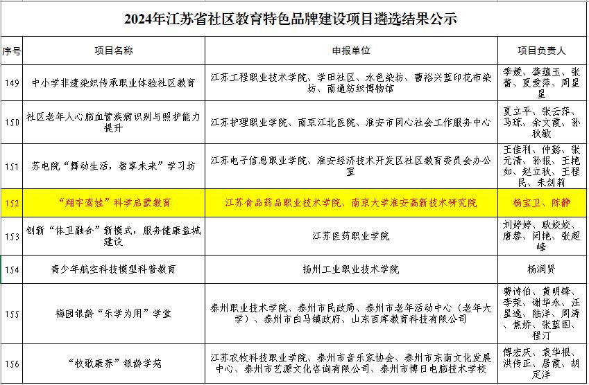 近日,江苏省教育厅发布了《2024年省级社区教育特色品牌建设项目遴选结果公示》,乐竞药学院与南京大学淮安高新技术研究院共同申报的“‘翔宇鸾娃’科学启蒙教育”项目成功入选。
