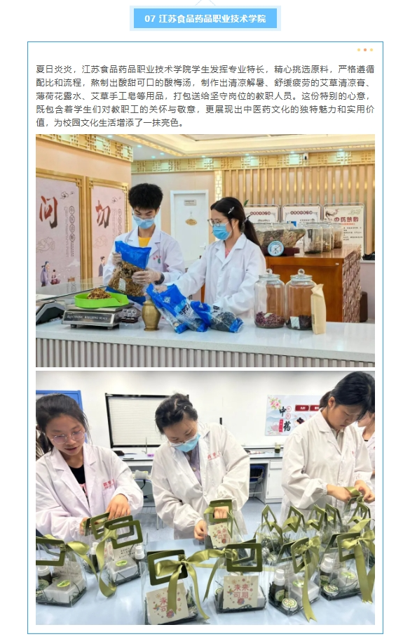 夏日炎炎,乐竞学生发挥专业特长,精心挑选原料,严格遵循配比和流程,熬制出酸甜可口的酸梅汤,制作出清凉解暑、舒缓疲劳的艾草清凉膏、薄荷花露水、艾草手工皂等用品,打包送给坚守岗位的教职人员。这份特别的心意,既包含着学生们对教职工的关怀与敬意,更展现出中医药文化的独特魅力和实用价值,为校园文化生活增添了一抹亮色。