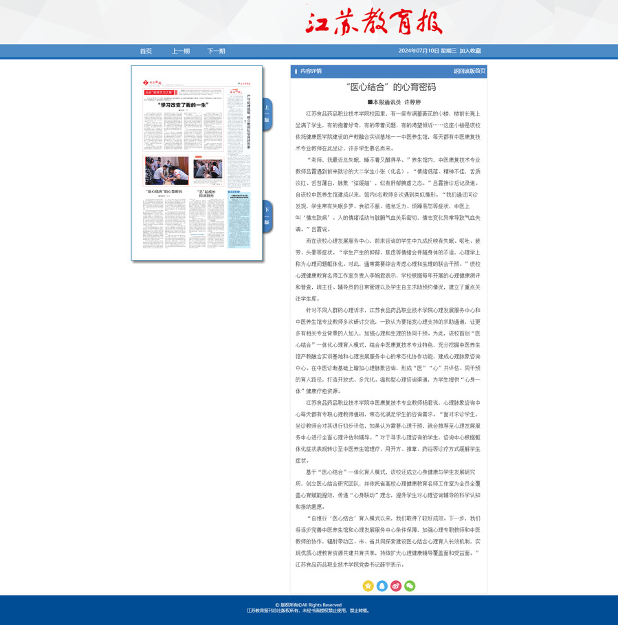 基于“医心结合”一体化育人模式,该校还成立心身健康与学生发展研究所,创立医心结合研究团队,并依托省高校心理健康教育名师工作室为全员全覆盖心育赋能提效,传递“心身联动”理念,提升学生对心理咨询辅导的科学认知和接纳意愿。