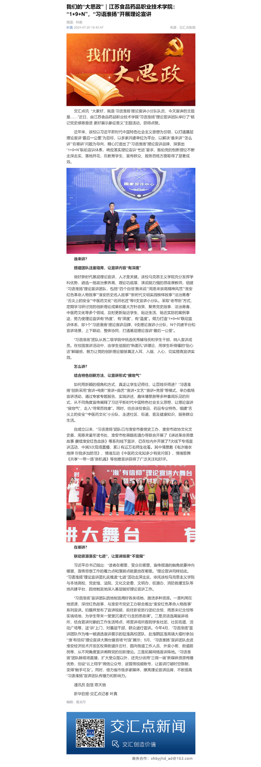 如何用新颖的视角和方式,真正让学生记得住、让百姓听得进?“习语淮扬”创新采用“宣讲+电影”“宣讲+曲艺”“宣讲+文艺”“宣讲+竞答”等模式,举办数场宣讲活动,通过专家专题报告、实境讲述、趣味情景剧等多种喜闻乐见的形式,从不同角度宣传阐释了习近平新时代中国特色社会主义思想,让理论宣讲“接地气”,走入“寻常百姓家”。同时,结合该校食品、药品专业特色,组建“舌尖上的安全”“中医药文化”小分队,走进社区、街道,普及健康知识,服务群众生活。