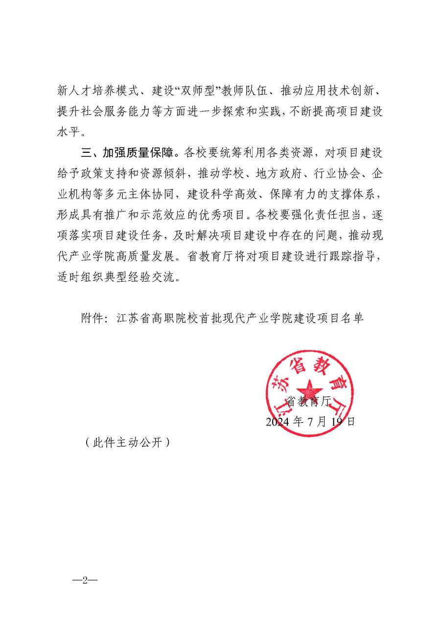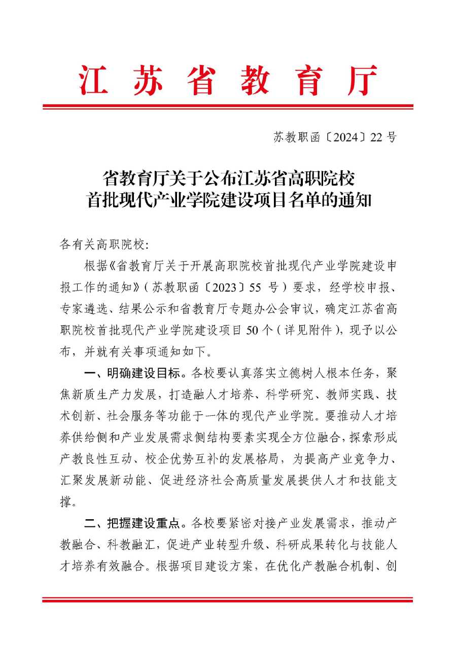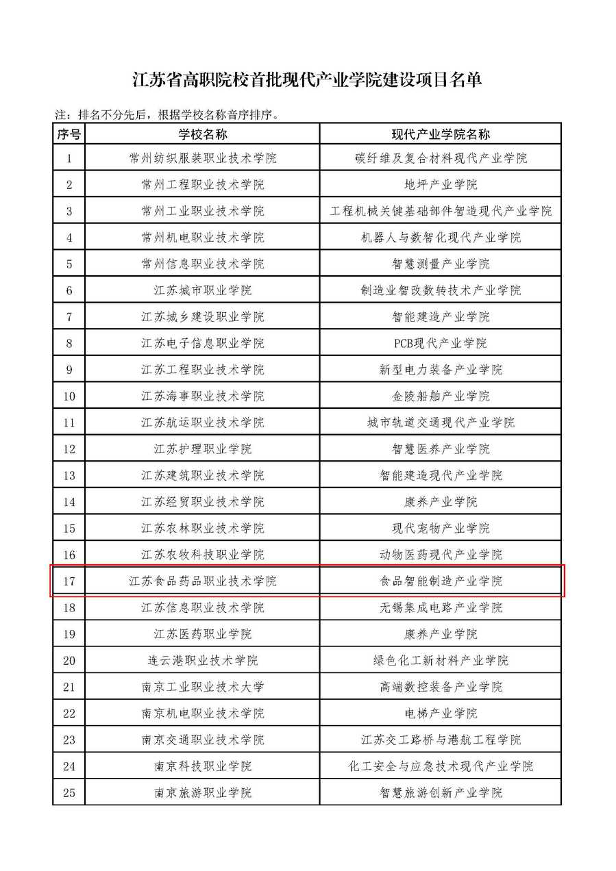 近日,江苏省教育厅正式发文(苏教职函〔2024〕22号),公布了江苏省高职院校首批现代产业学院建设项目名单。乐竞“食品智能制造产业学院”成功入选。