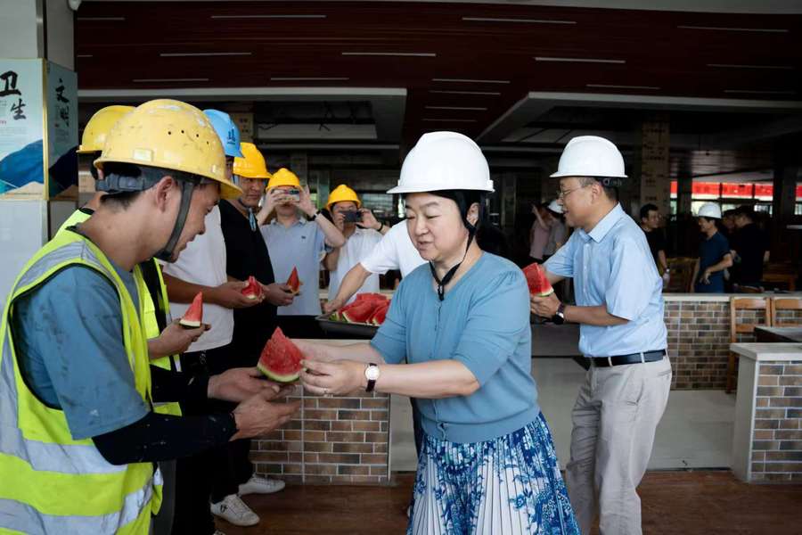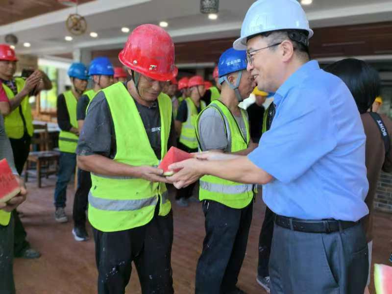 视察过程中,校领导特别关注了施工人员的防暑降温措施,强调在当前高温天气下,必须做好施工人员的健康保障工作,确保大家的安全。同时,亲手为施工人员送上夏日消暑“神器”西瓜与冰水,叮嘱大家要注意身体,确保在炎炎夏日里也能安全、高效地完成施工任务。