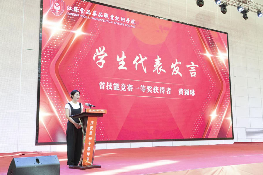 省技能大赛一等奖获得者黄颖琳作为学生代表进行了发言,她代表全校同学向老师们表达了感谢与敬意,并送上节日祝福。