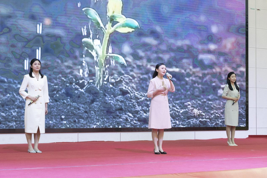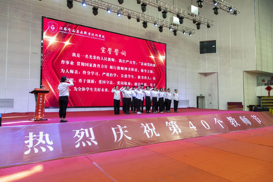 陈子怡、杨鑫、王艺、胡媛媛四位教师为大家带来舞蹈和诗朗诵《因为是老师》,表达了一批又一批的苏食院人把青春韶华、才情抱负,无私地抛洒在食品药品职业教育的热土上,书写着一代又一代人携手奋进的诗篇。