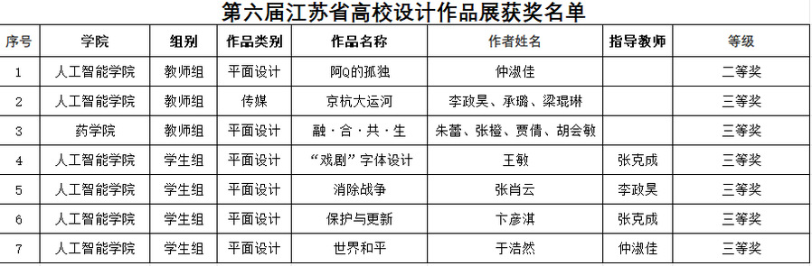 根据《省教育厅办公室关于举办第六届江苏省高校设计作品展的通知》(苏教办体艺函〔2024〕5 号),组委会共收到全省136所高校投稿各类设计作品9332 件。经专家组评选,共评出一等奖151 件,其中教师组35 件、学生组116 件;二等奖294 件,其中教师组61 件、学生组233 件;三等奖559 件,其中教师组102 件、学生组457 件。涵盖平面设计、传媒、现代手工艺、室内设计、产品设计、景观设计、服装设计、建筑设计等设计类别。