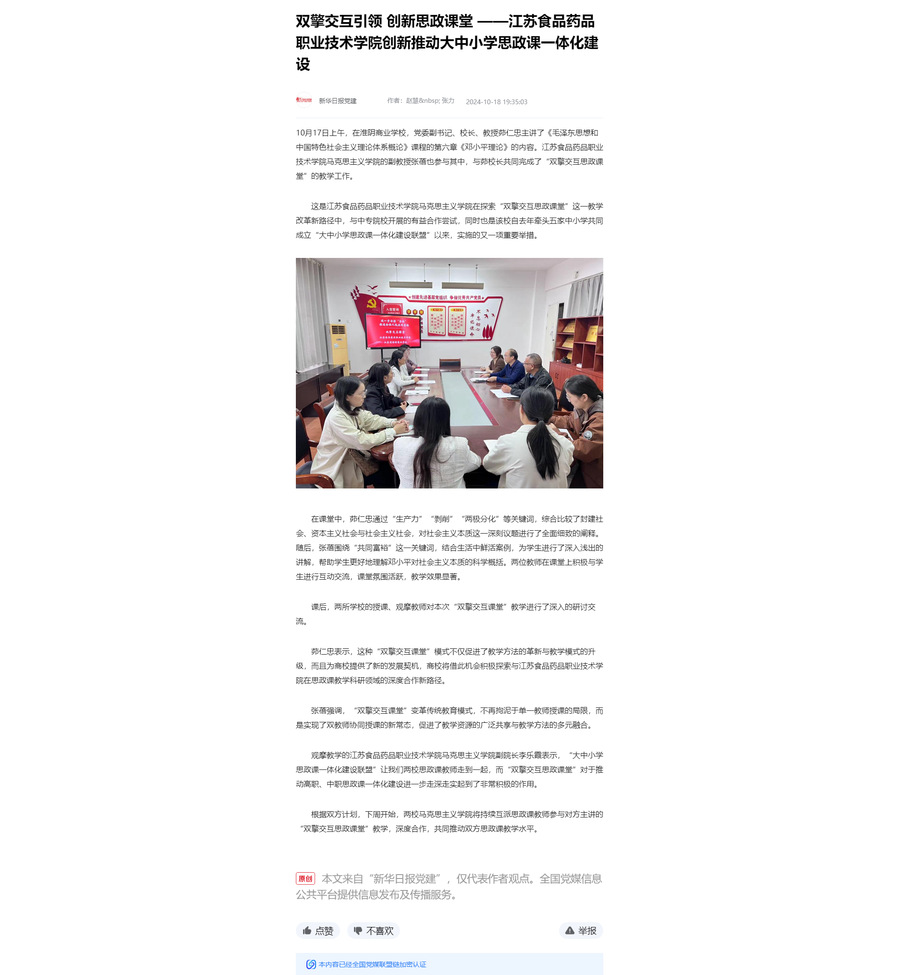 10月17日上午,在淮阴商业学校,党委副书记、校长、教授茆仁忠主讲了《毛泽东思想和中国特色社会主义理论体系概论》课程的第六章《邓小平理论》的内容。乐竞马克思主义学院的副教授张蓓也参与其中,与茆校长共同完成了“双擎交互思政课堂”的教学工作。
