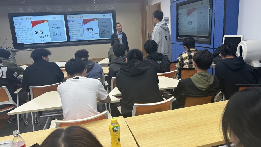 活动特别邀请了江苏苏盐井神股份有限公司第二分公司高级工程师、高级技师、江苏省企业首席技师、江苏工匠、江苏省产业教授、江苏省劳动模范张红光进行宣讲。张红光分享了自己在一线岗位上钻研专业技术创新实践的宝贵经历,以及根据生产实际需要进行的一些有效的思考、创新和改造,并与现场师生深入的互动交流三个问题:学校学习的知识有用吗?学校学习的知识够用吗?高技能人才需具备的什么素质?同时,他向同学们推荐《细节决定成败》这本书,并现场领读指导。