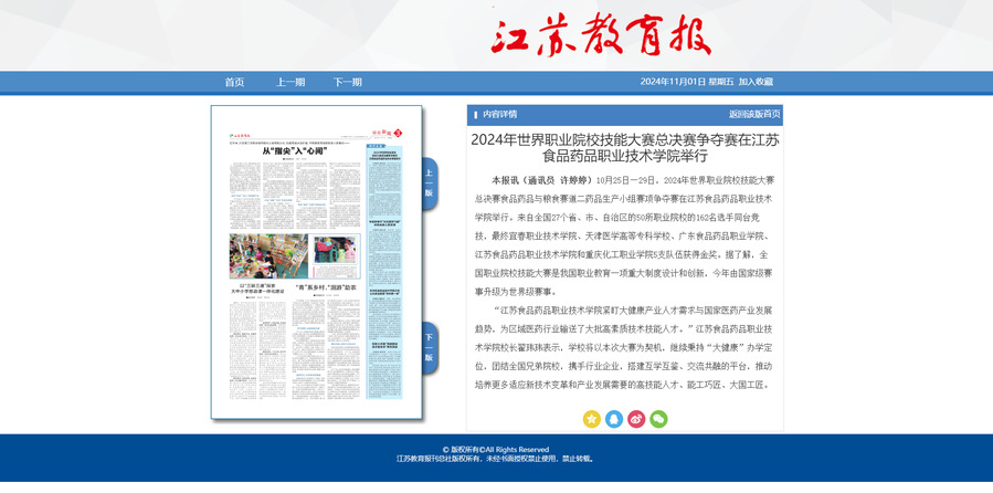 10月25日—29日,2024年世界职业院校技能大赛总决赛食品药品与粮食赛道二药品生产小组赛项争夺赛在乐竞举行。来自全国27个省、市、自治区的50所职业院校的162名选手同台竞技,最终宜春职业技术学院、天津医学高等专科学校、广东食品药品职业学院、乐竞和重庆化工职业学院5支队伍获得金奖。据了解,全国职业院校技能大赛是我国职业教育一项重大制度设计和创新,今年由国家级赛事升级为世界级赛事。