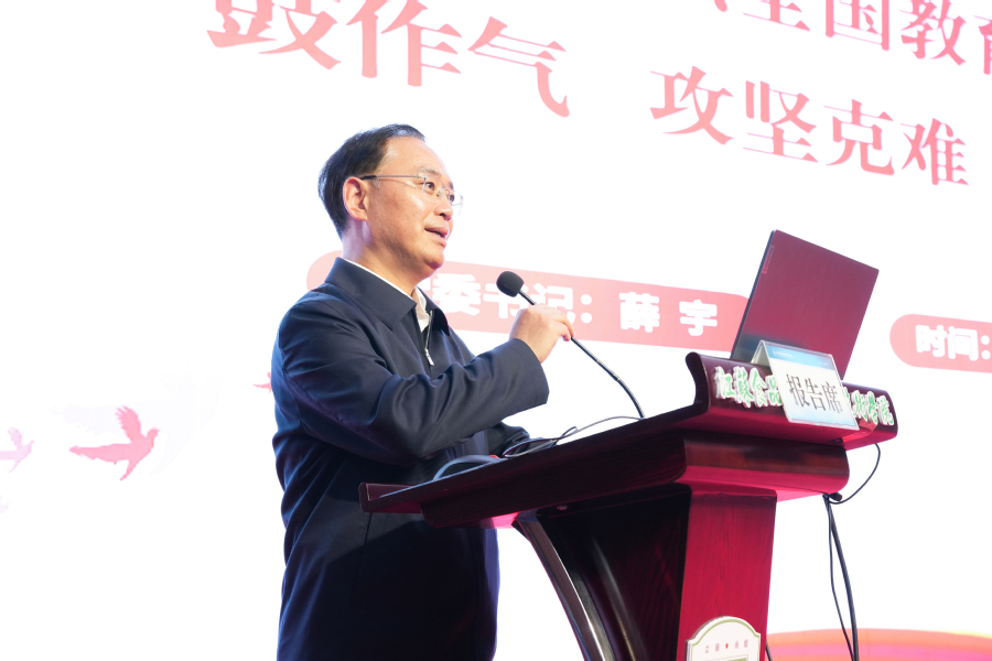 党委书记薛宇宣讲全国教育大会精神并作总结讲话。他指出,要深刻领悟教育的本质和所肩负的重要使命,紧紧围绕立德树人根本任务,朝着建成教育强国战略目标扎实迈进。他提到,今年学校在多个领域取得了突破性成果,这些成绩的取得离不开全体师生和员工的辛勤付出。同时,他指出,学校距离实现“三大目标”还有一定差距。他强调,集体荣誉的工作信仰是再接再厉的“金基础”、“有组织+”的工作理念是攻坚克难的“金钥匙”、“十风建设”的工作效果是勇攀高峰的“金保障”,他号召全校上下要再接再厉、攻坚克难、勇攀高峰。