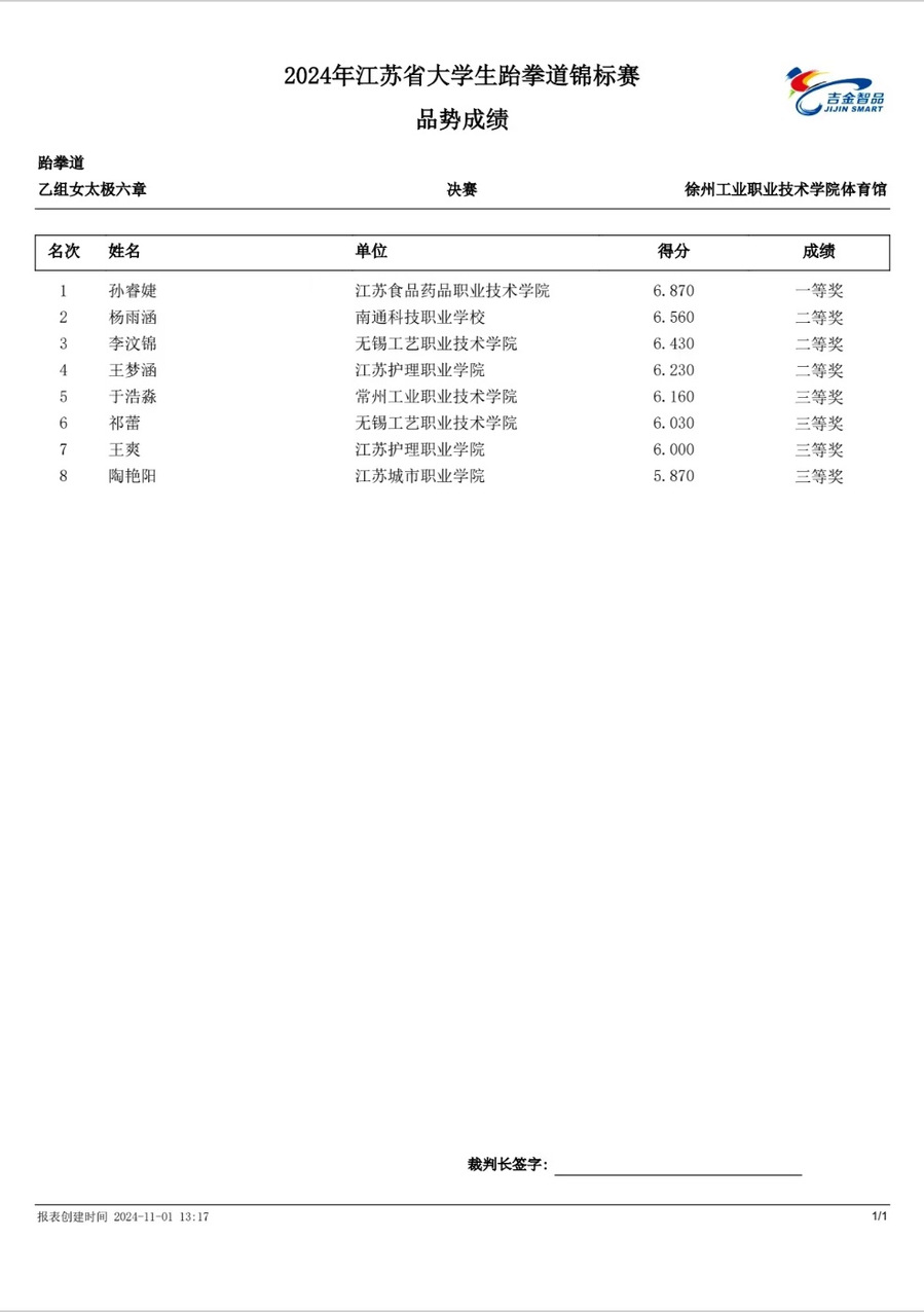 经过前期的严格选拔与刻苦训练,在教练员施国山老师的悉心指导下,乐竞数字经济学院会计242班的孙睿婕同学在女子品势太极6章项目中以6.870分的成绩脱颖而出,并荣获一等奖(第一名),为学校增添了光彩,是其自身辛勤付出的丰厚回报,同时也为弘扬校园体育文化贡献了积极力量,充分展现了乐竞大学生的精神风貌。
