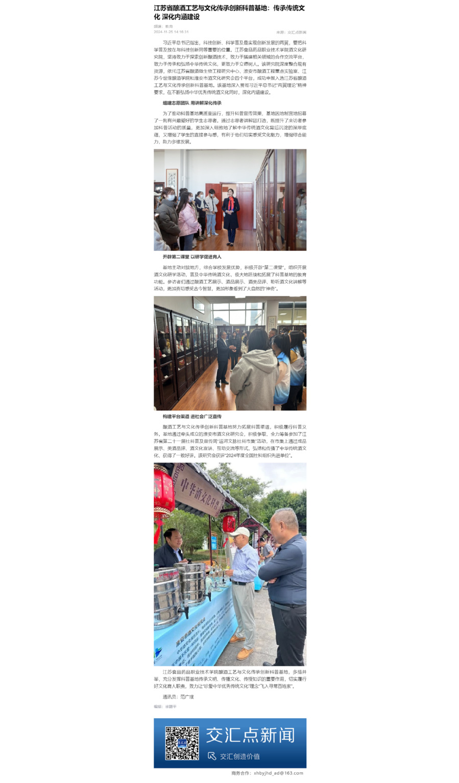 酿酒工艺与文化传承创新科普基地努力拓展科普渠道,积极履行科普义务。基地通过牵头成立的淮安市酒文化研究会,积极争取、全力筹备参加了江苏省第二十一届社科普及宣传周“运河文脉社科市集”活动,在市集上通过成品展示、美酒品评、酒文化宣讲、互动交流等形式,弘扬和传播了中华传统酒文化,获得了一致好评。该研究会获评“2024年度全国社科组织先进单位”。