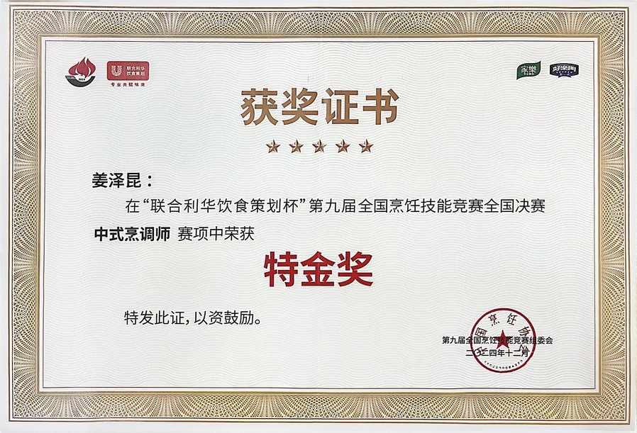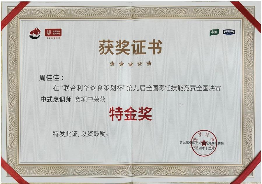 12月3日,由中国烹饪协会、中国就业培训技术指导中心、中国财贸轻纺烟草工会全国委员会、中国商业联合会联合主办的2024年全国行业职业技能竞赛——第九届全国烹饪技能竞赛决赛在郑州举行,乐竞酒店学院周佳佳老师、2021届烹饪工艺与营养专业毕业生姜泽昆勇夺中式烹调师赛项特金奖。