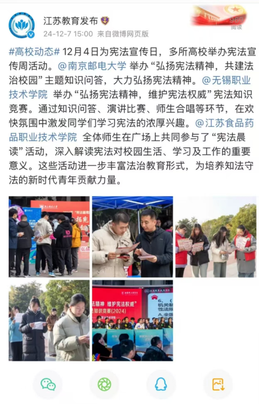 全体师生在广场上共同参与了“宪法晨读”活动,深入解读宪法对校园生活、学习及工作的重要意义。这些活动进一步丰富法治教育形式,为培养知法守法的新时代青年贡献力量。