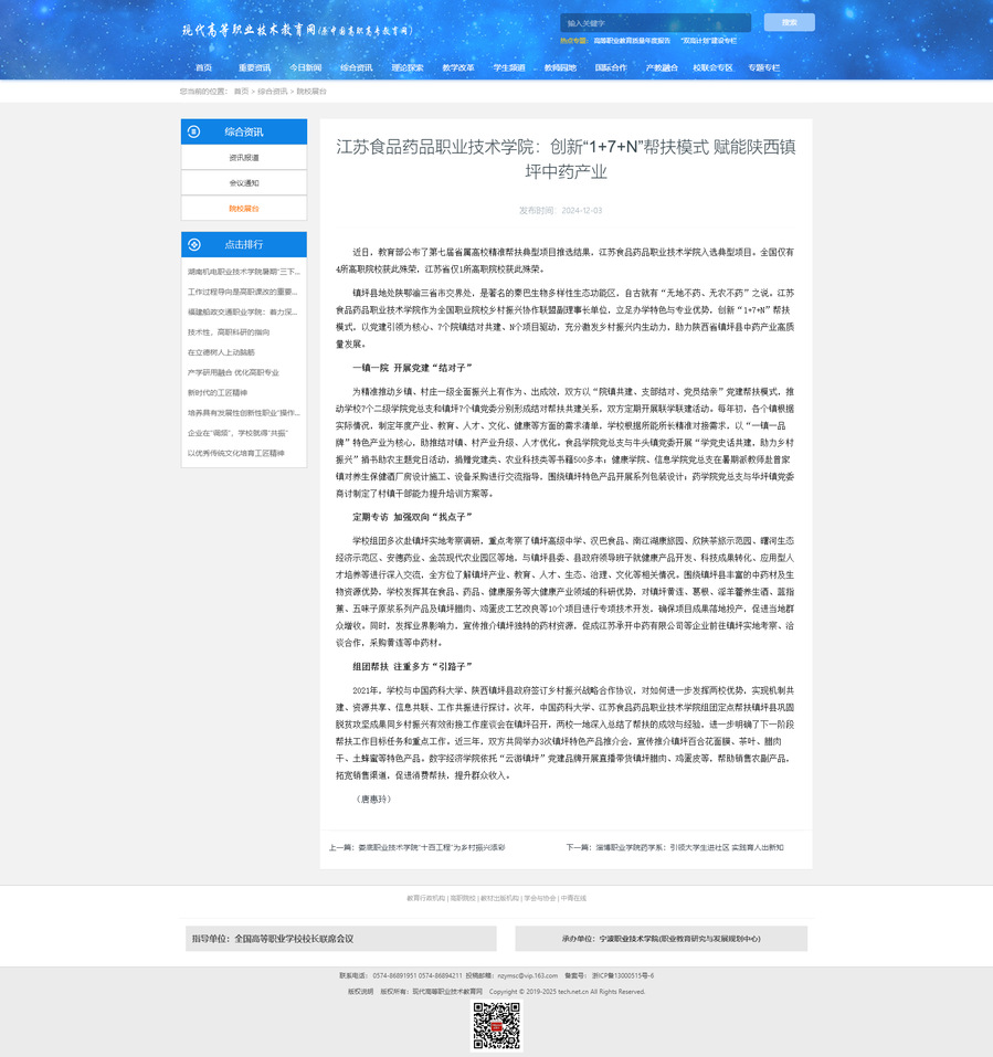 镇坪县地处陕鄂渝三省市交界处,是著名的秦巴生物多样性生态功能区,自古就有“无地不药、无农不药”之说。乐竞作为全国职业院校乡村振兴协作联盟副理事长单位,立足办学特色与专业优势,创新“1+7+N”帮扶模式,以党建引领为核心、7个院镇结对共建、N个项目驱动,充分激发乡村振兴内生动力,助力陕西省镇坪县中药产业高质量发展。