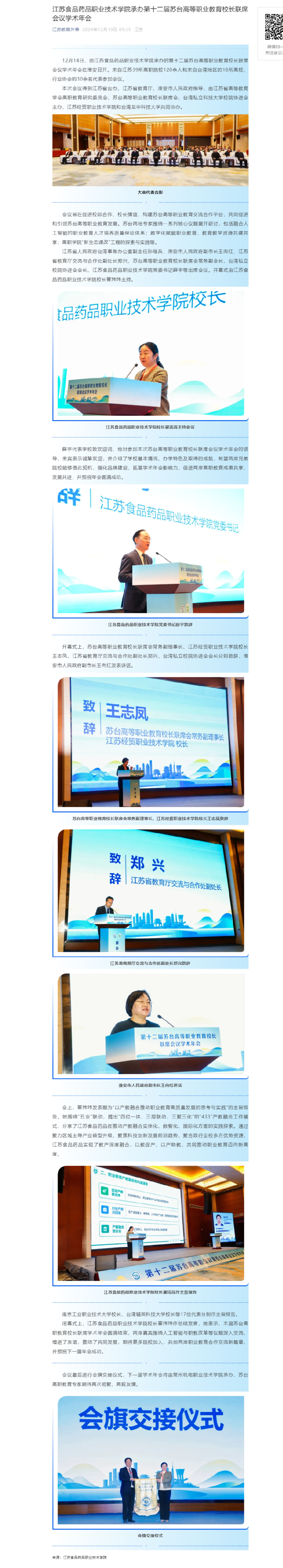 为进一步深化两岸高等职业教育合作,更好构建两岸高等职业教育平台,12月14号,第十二届苏台高等职业教育校长联席会议学术年会在我市举行。