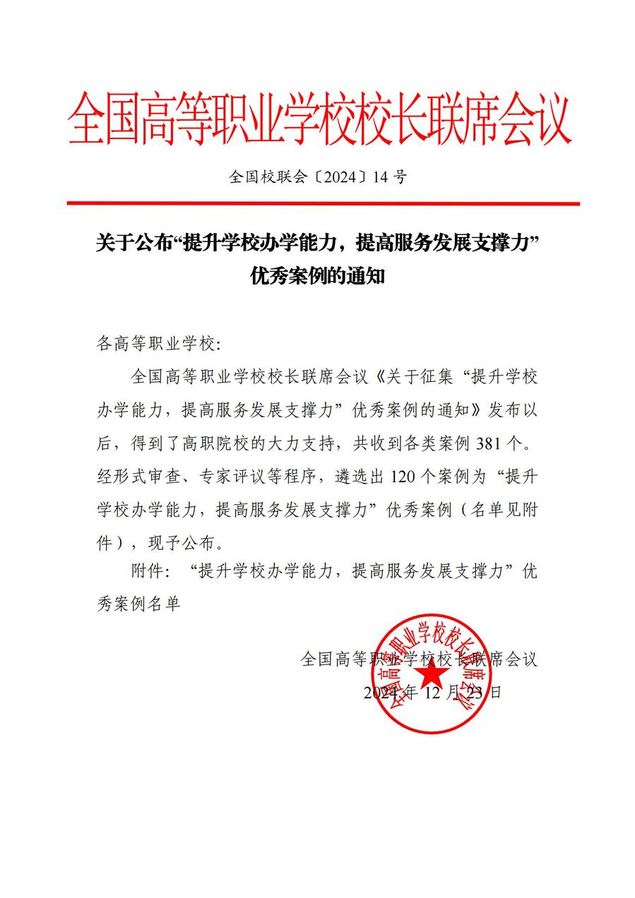 “提升学校办学能力,提高服务发展支撑力”优秀案例征集活动,由全国高等职业学校校长联席会议于2024年10月下旬开始开展,目的是为促进高职教育内涵式发展,为各高等职业学校提供可借鉴、可复制的模式和经验。