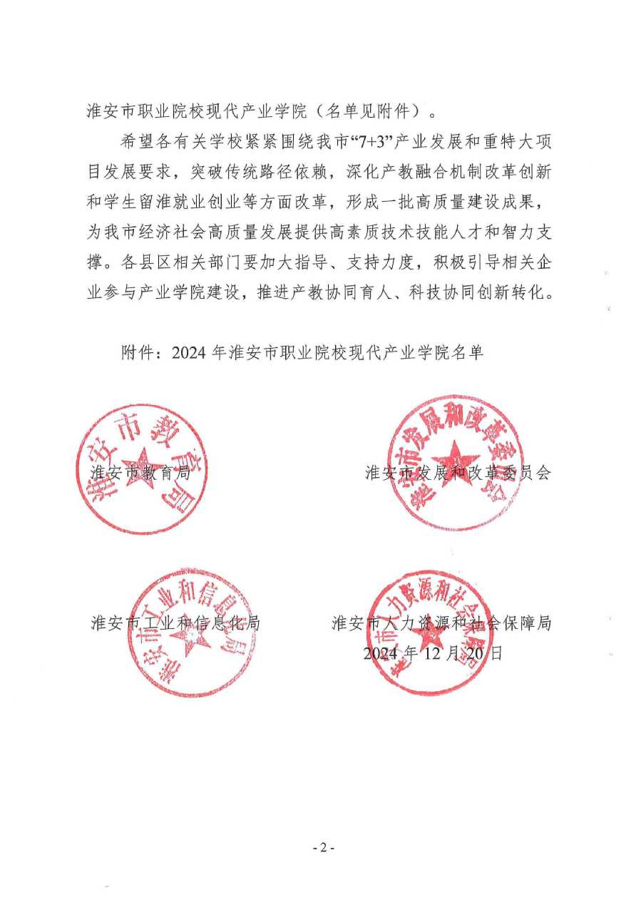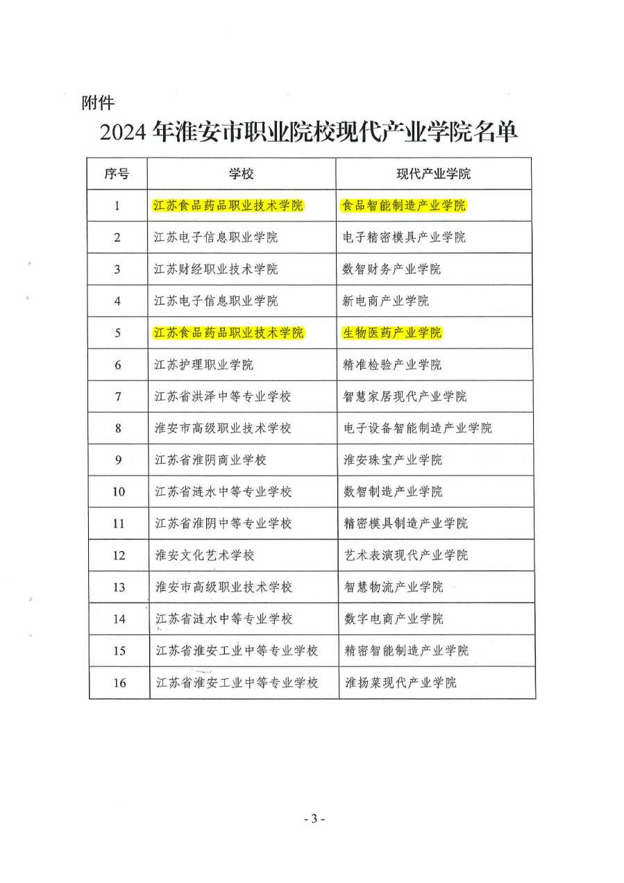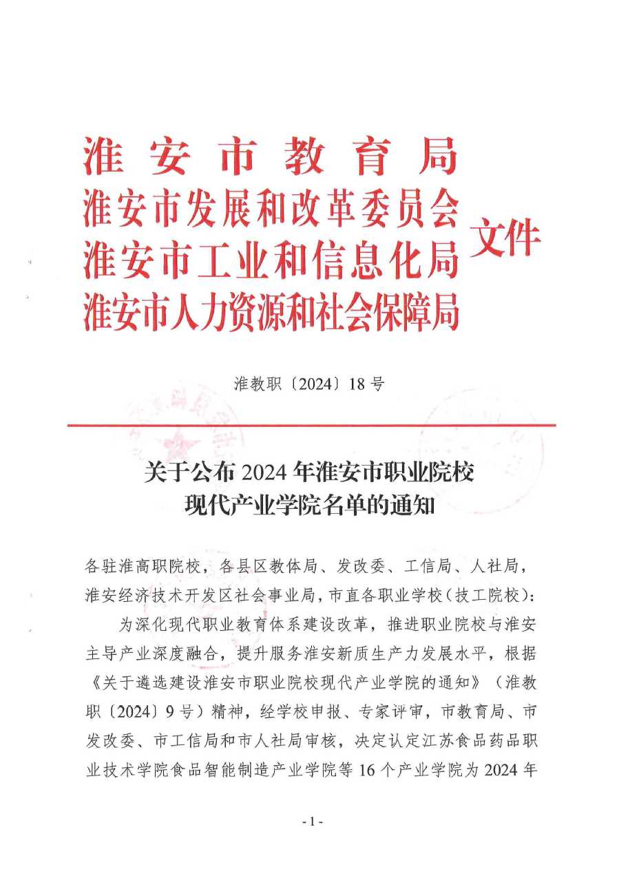 近日,淮安市教育局、淮安市发展和改革委员会、淮安市工业和信息化局、淮安市人力资源和社会保障局联合发文(淮教职〔2024〕18号),公布了2024年淮安市职业院校现代产业学院名单,乐竞推荐申报的“食品智能制造产业学院”“生物医药产业学院”成功入选。